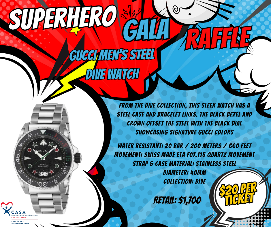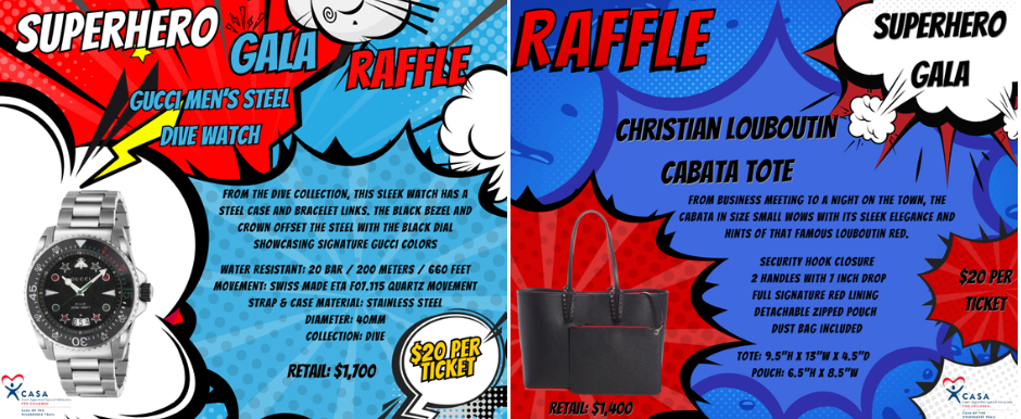 Have you ever wanted a Christian Louboutin Cabata Tote or a Gucci Men's Steel Dive Watch?! This is could be your lucky day! For a $20 donation, you will be entered for a chance to win one of these items! Winners will be drawn on August 2 at the Superhero Gala.